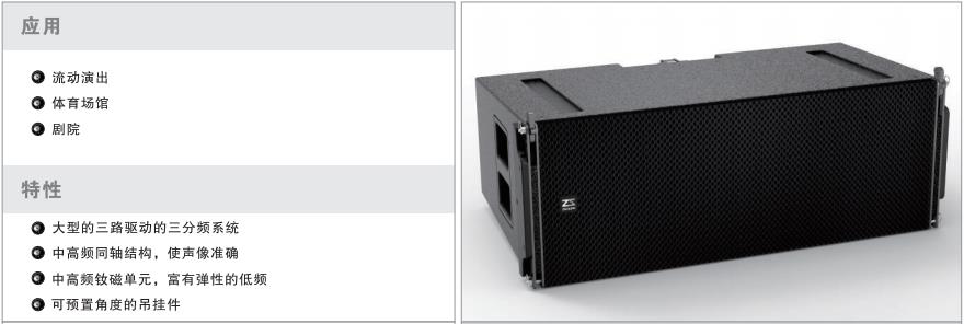 揚聲器單元:LF 2×12"(75mm音圈)釹磁低音, MF 1×10"(65mm音圈)釹磁中音, HF 2×3"釹磁壓縮高音;